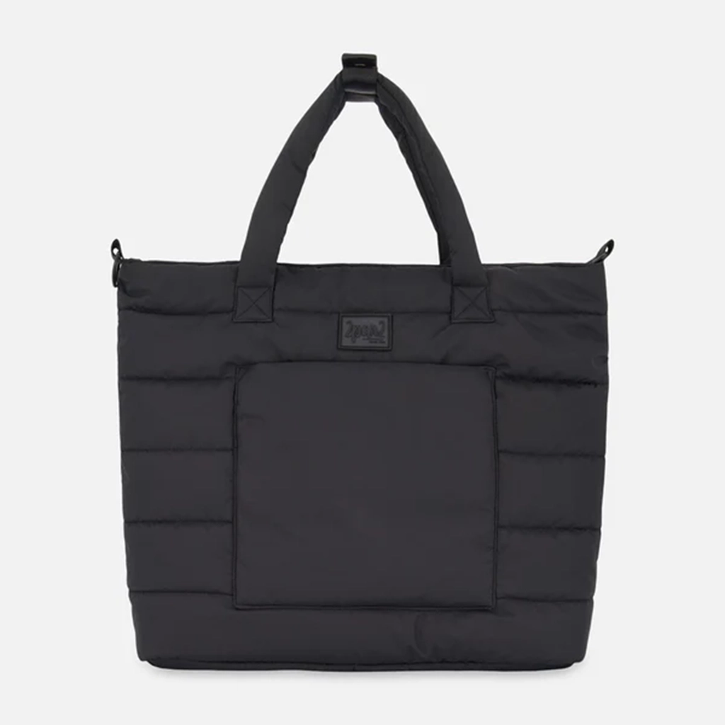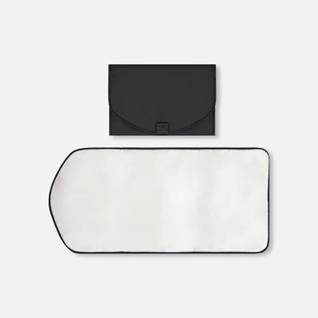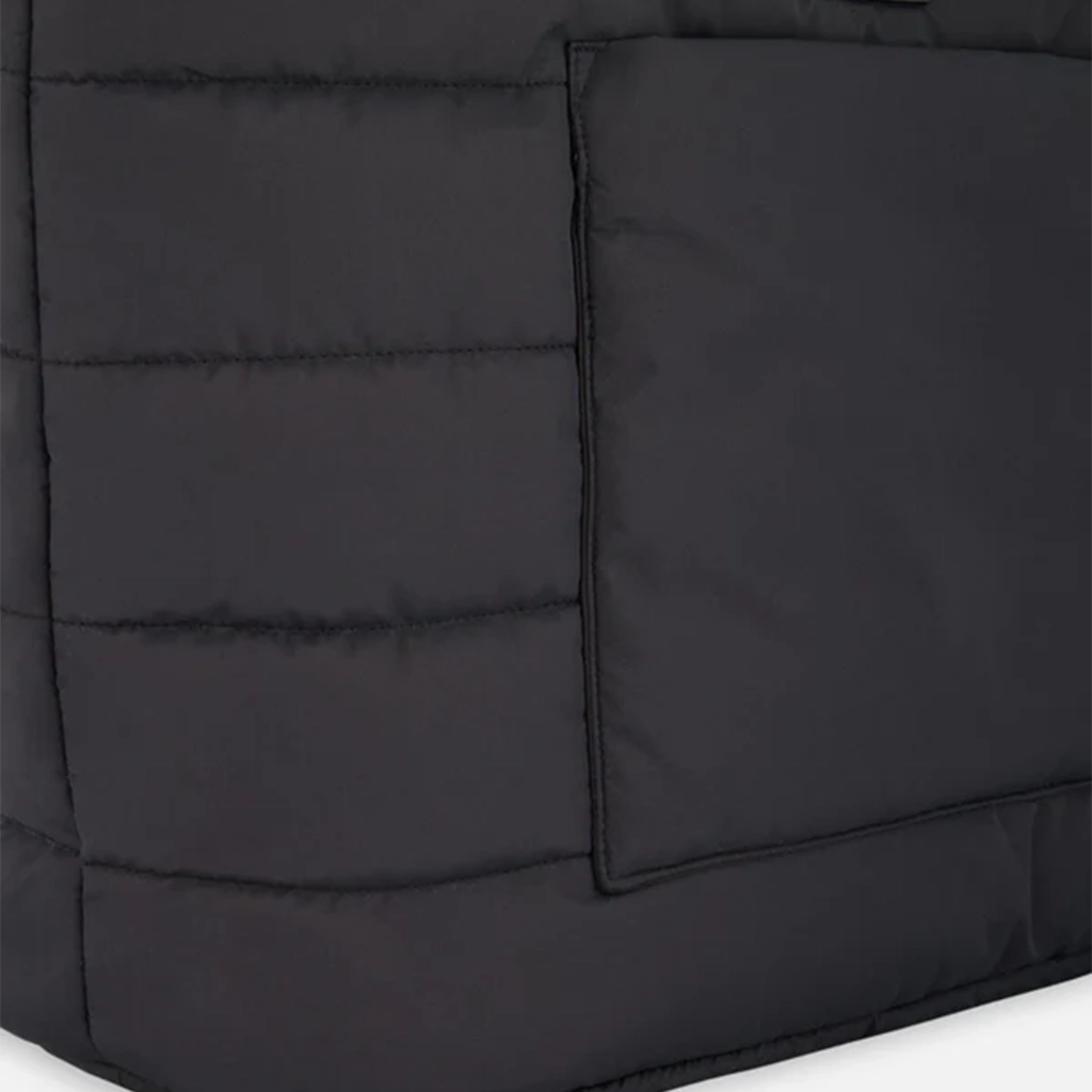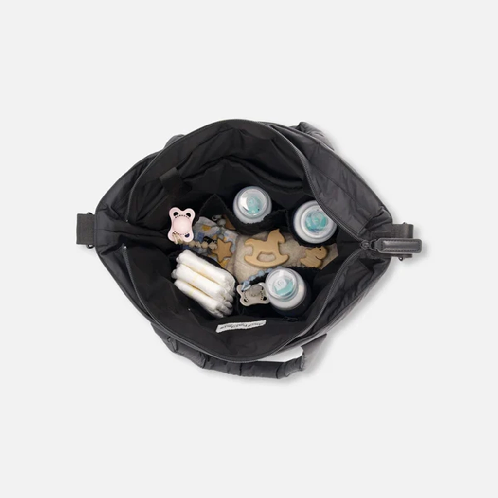 Notre sac à couches fourre-tout noir est rempli de poches et de détails pour contenir tous vos essentiels de maman et de bébé. L'intérieur comprend une grande poche contenant un tapis à langer lavable, des poches élastiques pour contenir les biberons et la nourriture pour bébé, ainsi qu'une poche à fermeture éclair pour les petits accessoires. À l'extérieur, on trouve une poche à fermeture éclair sur le devant, des poignées supérieures, une bandoulière détachable et de petites sangles détachables pour attacher au landau.