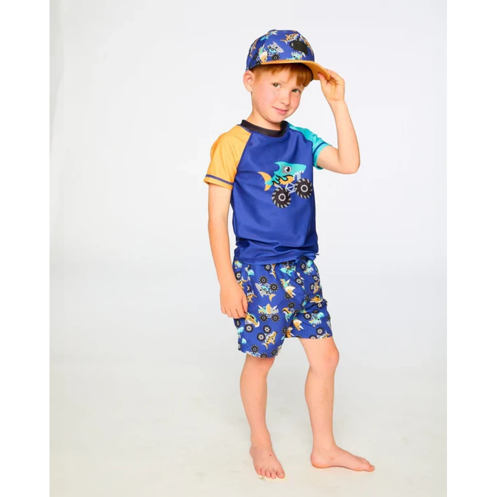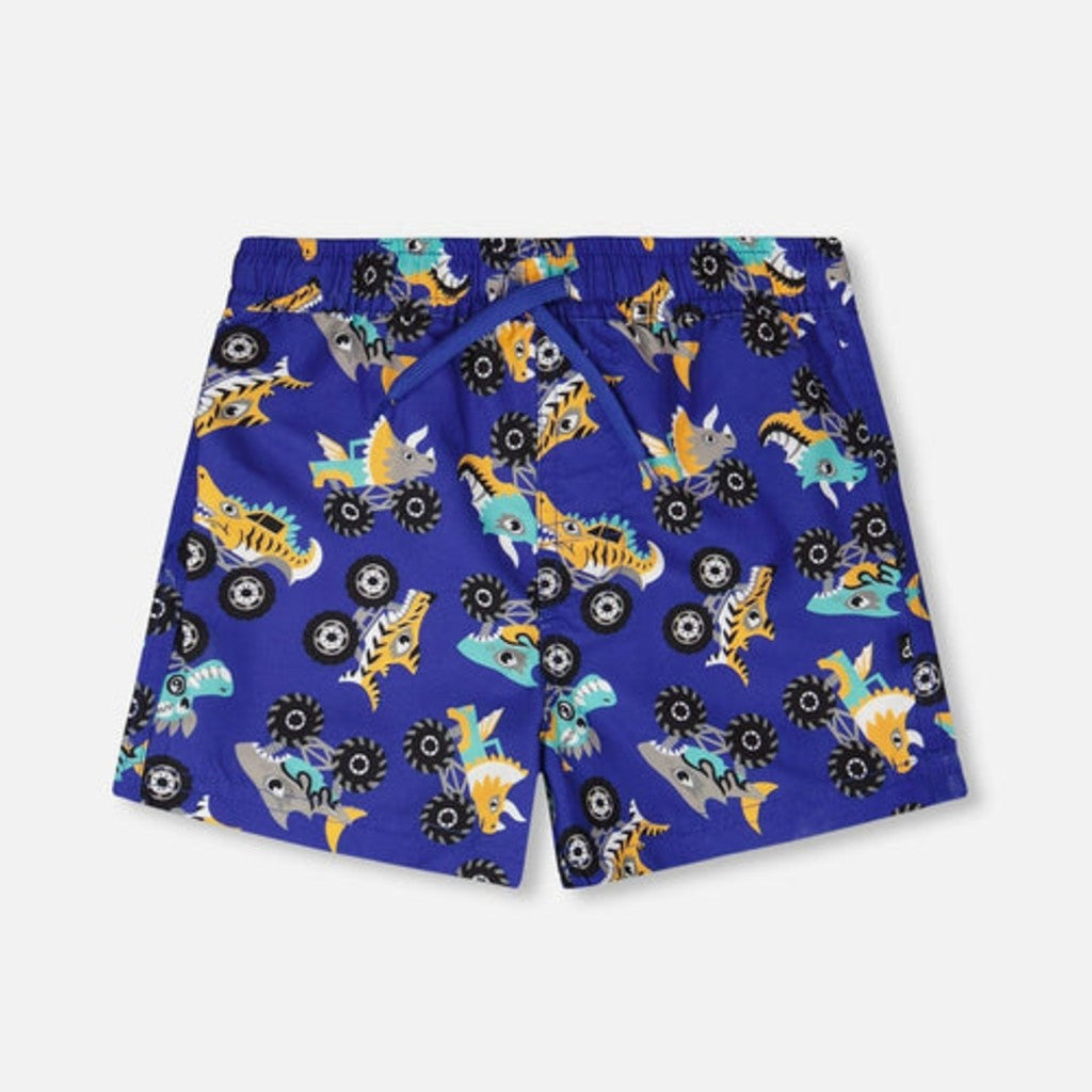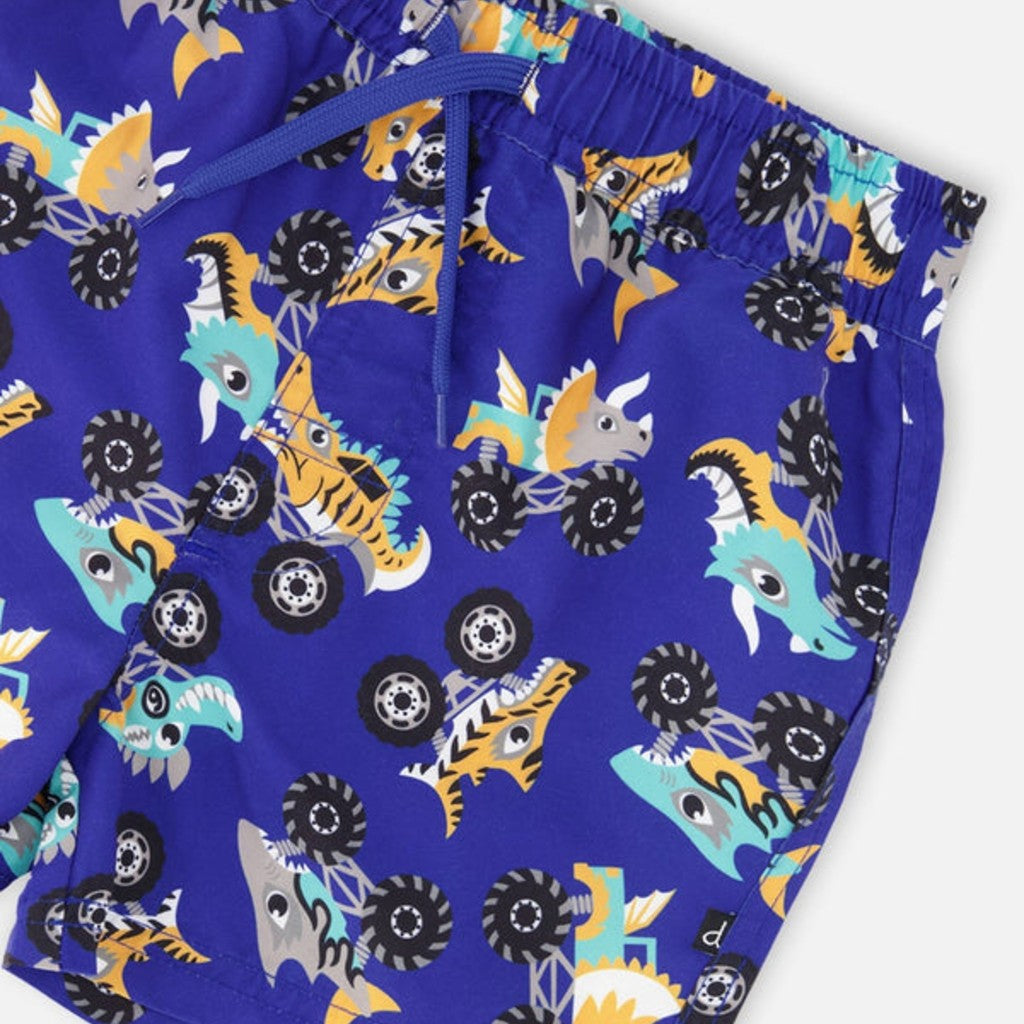 Le short maillot bleu à imprimé camions insuffle une touche ludique aux journées de baignade. Ce short mi-cuisse en polyester recyclé léger est décoré d’un motif original de monster trucks avec dinosaures, avec une doublure en maille pour plus de confort. Sa taille élastique et son cordon ajustable assurent un ajustement sûr et une grande liberté de mouvement.
