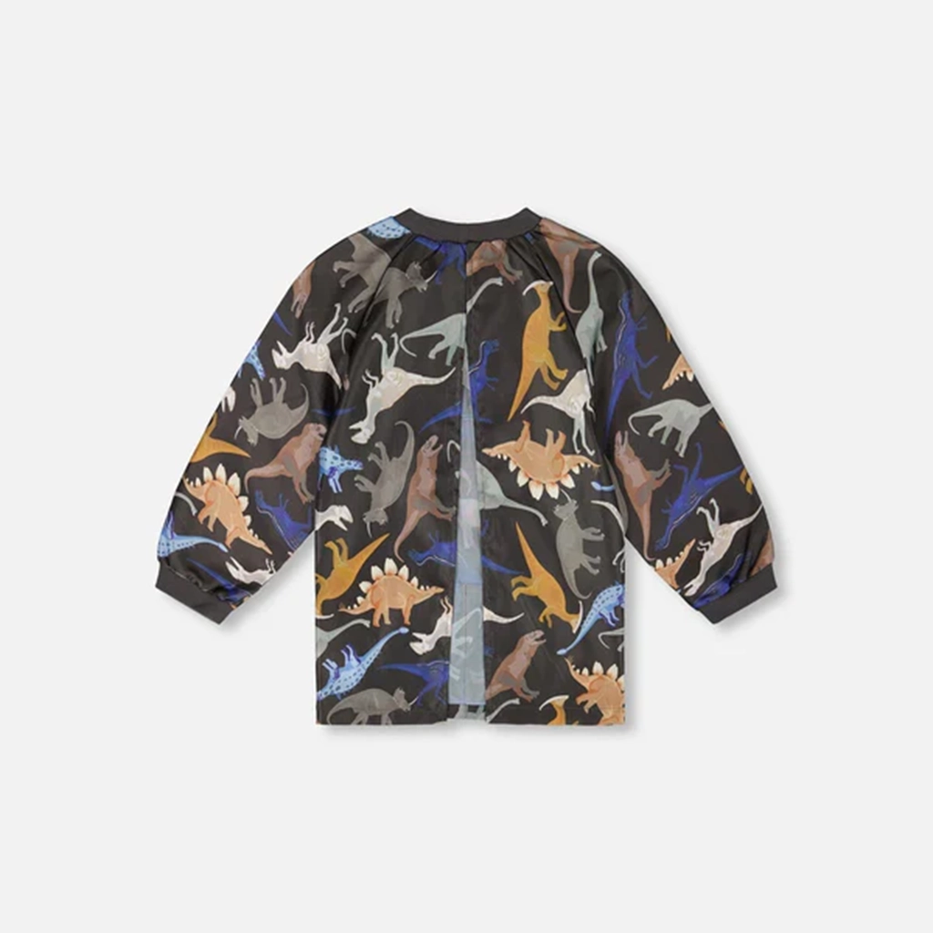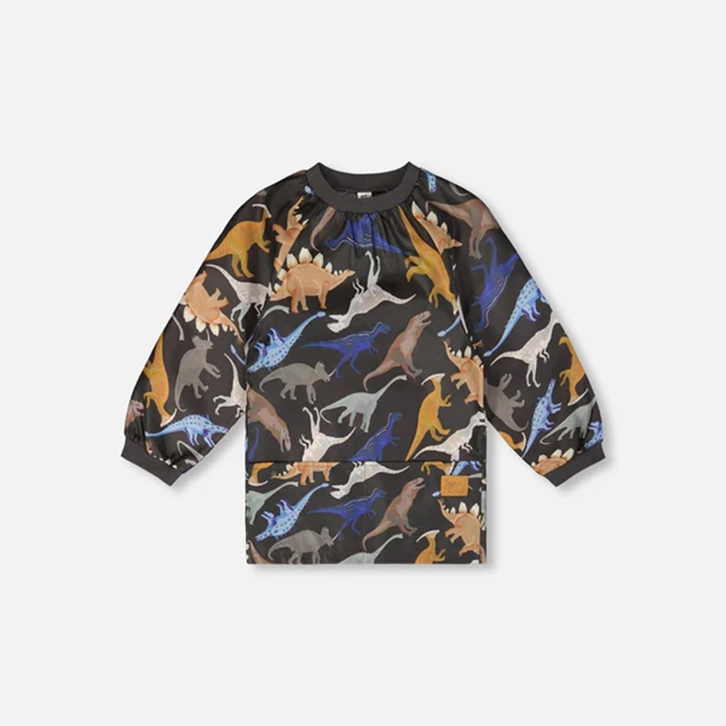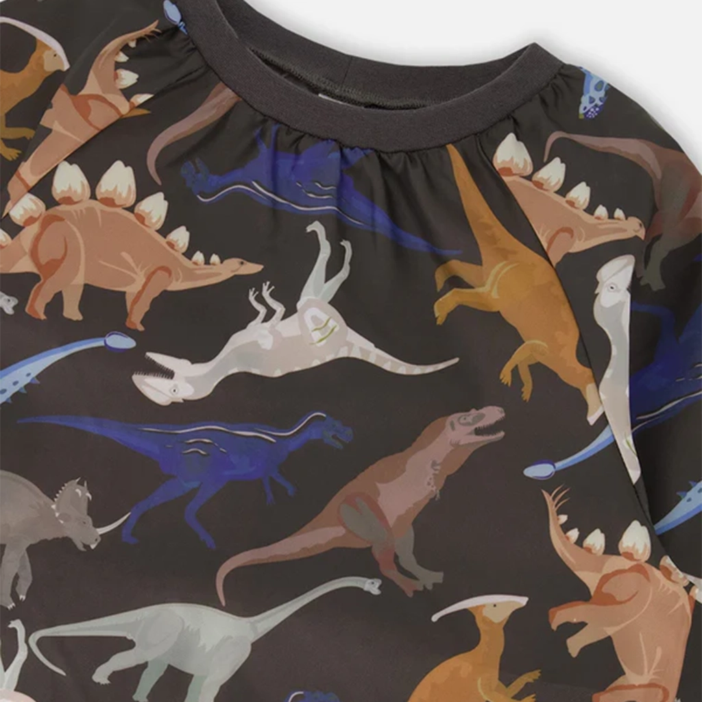 Fais de ton cours d’arts plastiques le moment le plus stylé de la journée avec notre tablier noir à imprimé de dinosaures. Confectionné en tissu écoresponsable fait à partir de bouteilles en plastique recyclées, ce tablier scolaire a une coupe à manches raglan longues, un col rond, des poignets élastiqués, deux poches frontales pratiques et une finition déperlante.