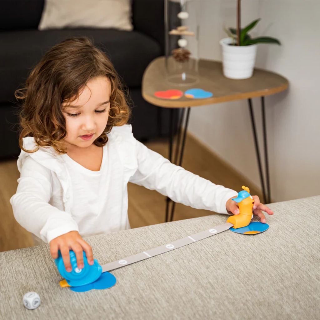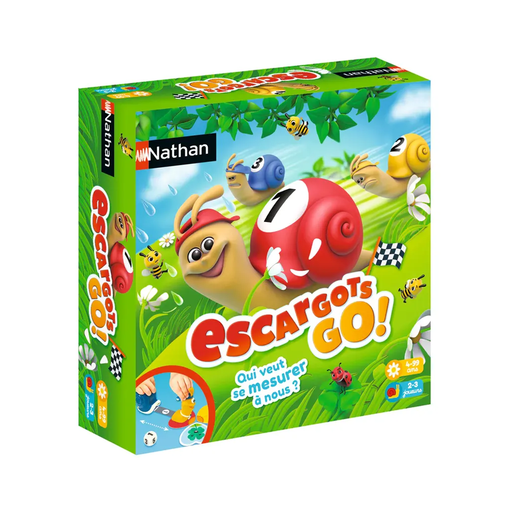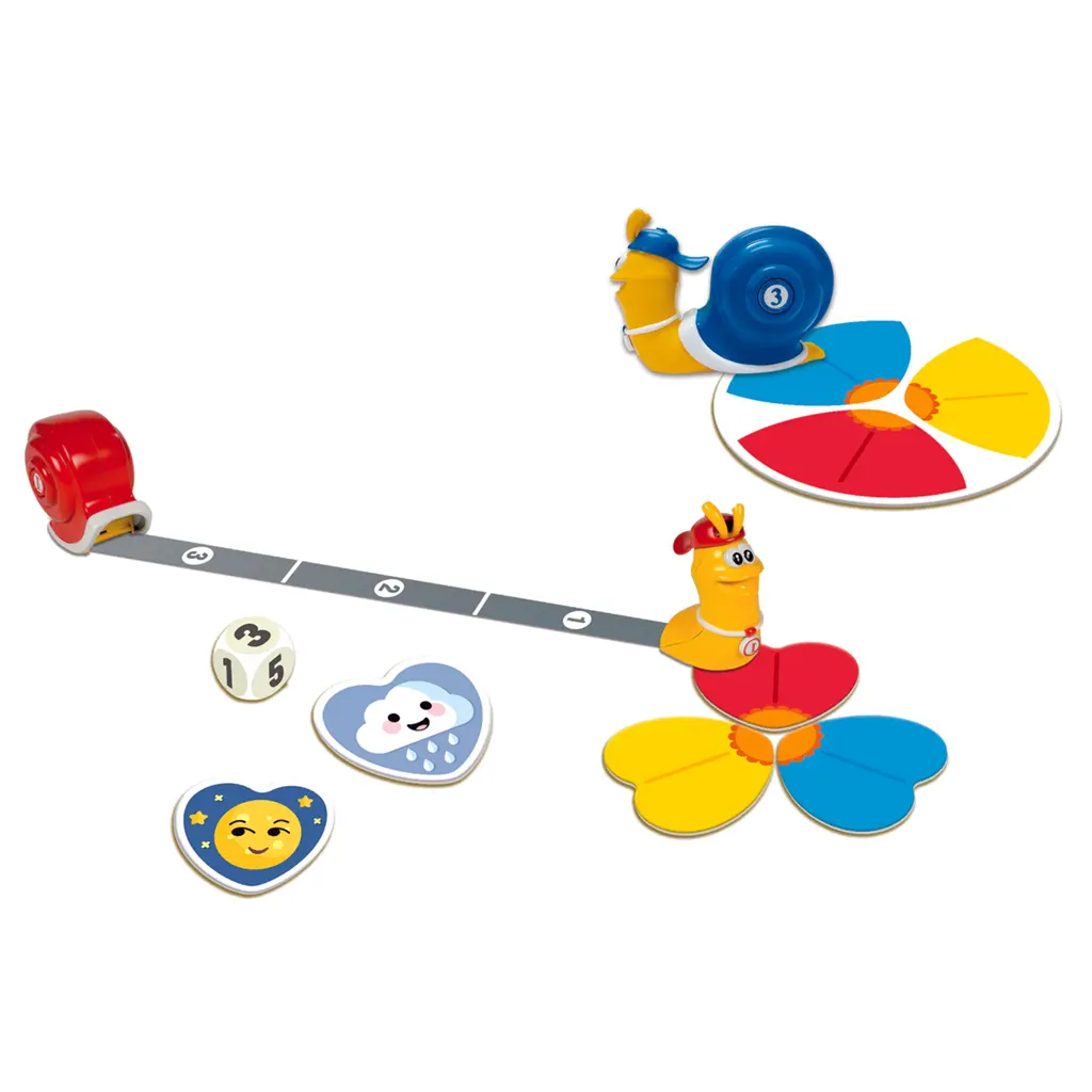 Vert, bleu, rouge, 3 escargots sont au départ de la course. Chaque joueur lance le dé et fait avancer son escargot d'une fleur à l'autre grâce à l'ingénieux mètre mesureur à l'intérieur de sa coquille. Quand tu retournes un pétale: rejoue grâce à la pluie, va sur la fleur que tu veux grâce au trèfle à 4 feuilles, passe ton tour avec la lune et retourne au point de départ avec le soleil. Qui sera le plus rapide à collecter tous ses pétales? Un jeu de parcours géant, de 2 à 3 joueurs.