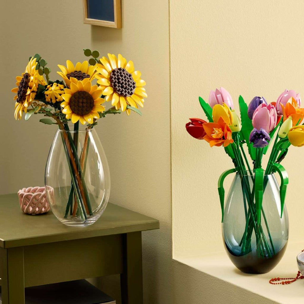 LEGO® TOURNESOLS – Le bouquet comprend 6 tournesols à différents stades : 1 bouton de tournesol, 3 tournesols qui commencent à fleurir et 2 grands tournesols complètement ouverts