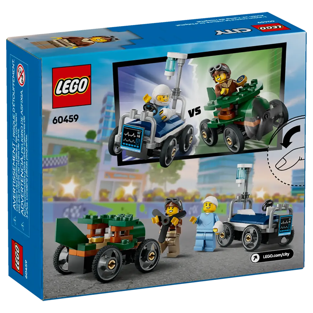 Offrez à votre petit amateur de course l’Ensemble de course L’avion contre la voiture-lit d’hôpital LEGO® City pour les enfants de 5 ans et plus. Ce jouet amusant de voitures de course comprend 2 caisses à savon et 2 figurines. Les enfants peuvent opposer la pilote de l’avion au patient dans le lit d’hôpital. Qui remportera la victoire? Prenez place pour une course urbaine épique!