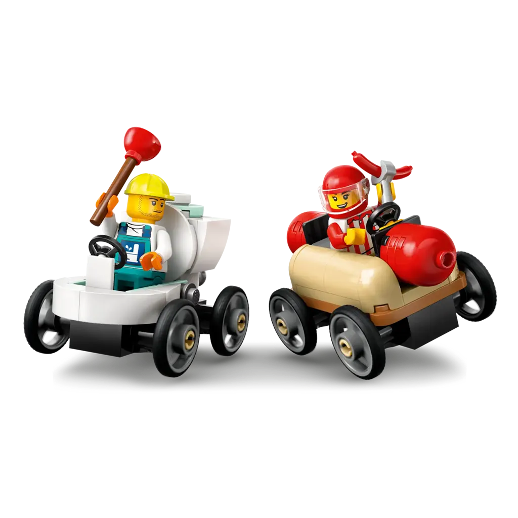 Que contient la boîte? – Tout ce dont les enfants ont besoin pour construire une rampe pour voitures, des caisses à savon en forme de hot-dog et de toilette et 4 figurines, dont un vendeur de hot-dogs et un plombier
