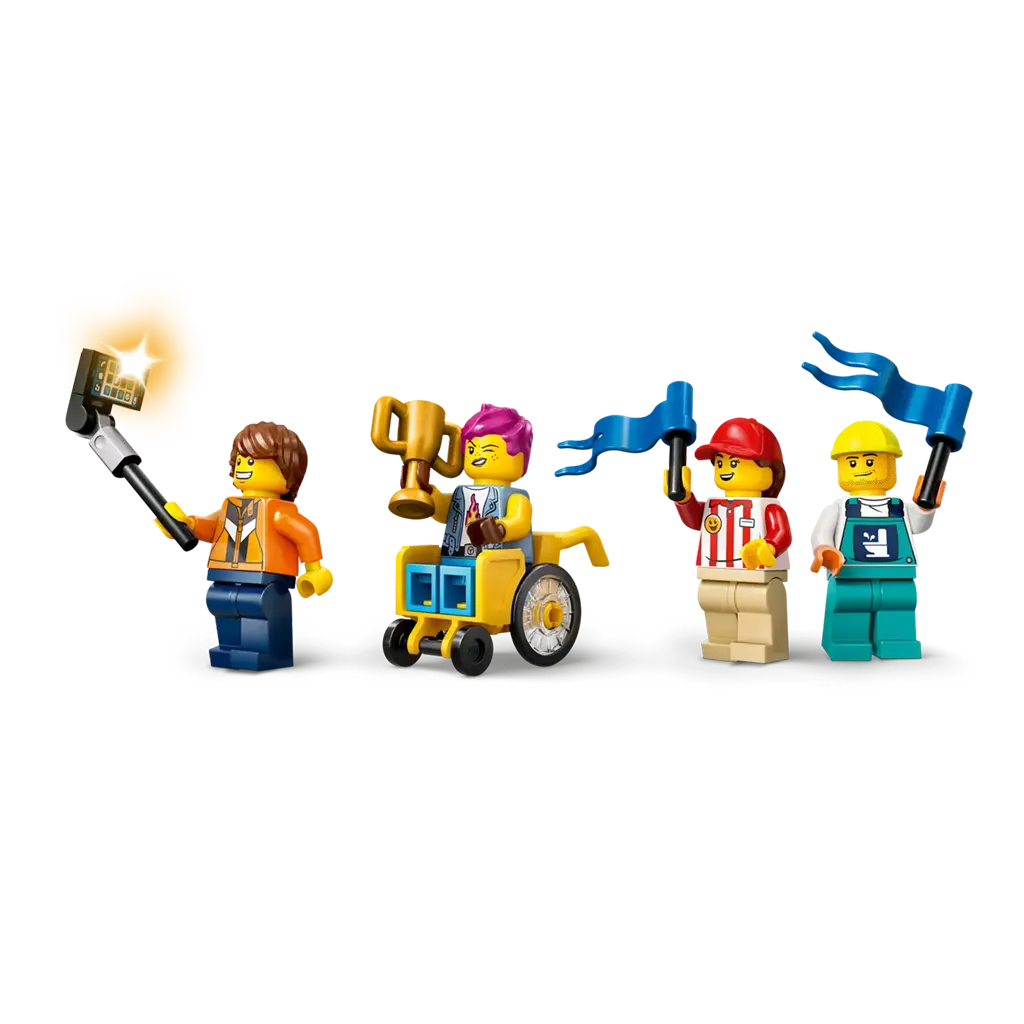 Accessoires pour figurines LEGO® – Cet ensemble de caisses à savon comprend des accessoires pour le jeu d’imitation, comme un fauteuil roulant, un trophée du vainqueur, une perche à égoportrait et un porte-outils avec des outils de mécanicien