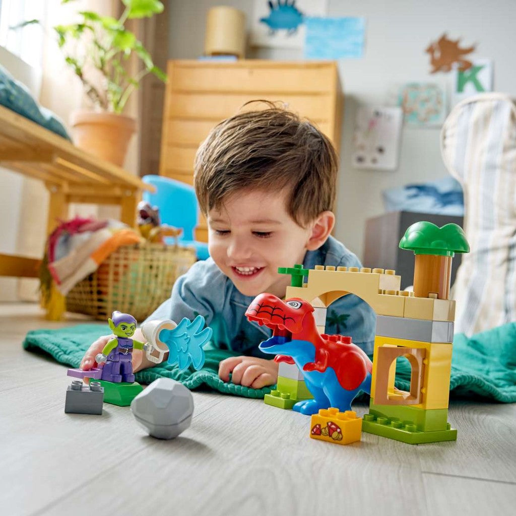 RICHE EN FONCTIONNALITÉS – Comprendune figurine LEGO® DUPLO® Spidey T. rex avec une bouche qui s'ouvre et se ferme, une figurine du Bouffon vert sur un véhicule volant avec un canon à eau, une salle du trésor et une arche
