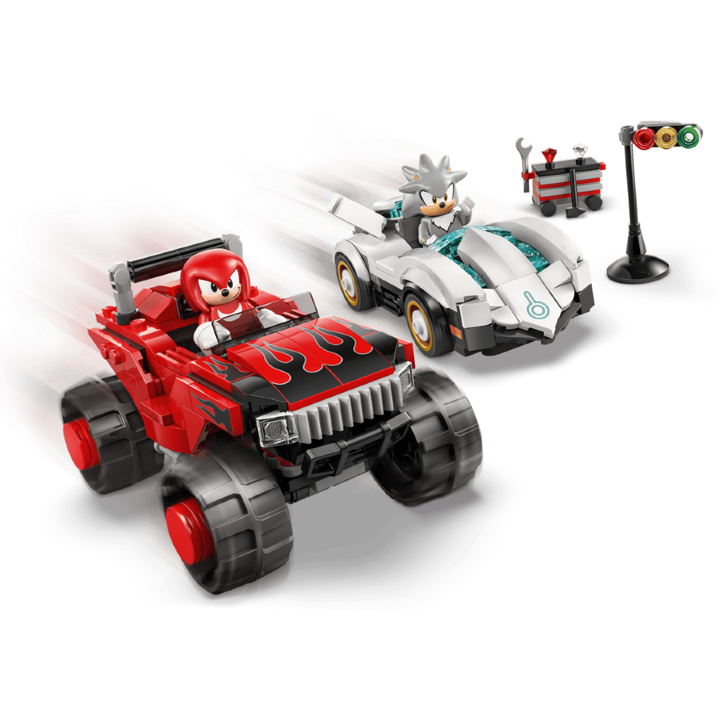 SILVER LE HÉRISSON, KNUCKLES ET PLUS ENCORE – Le set de construction inclut la toute première minifigurine LEGO® de Silver, une minifigurine de Knuckles, une boîte à outils, des outils, un feu de départ et des Émeraudes du Chaos rouge et blanche