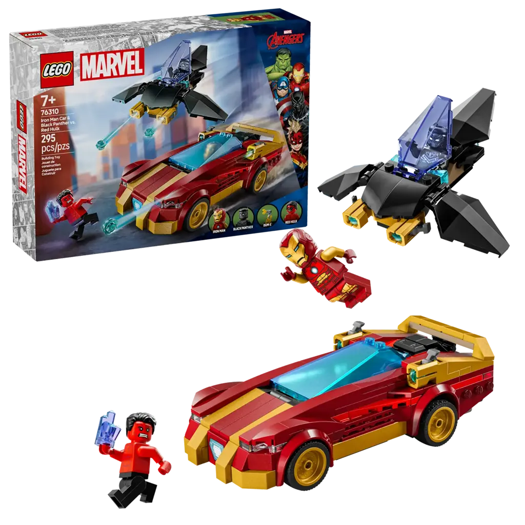 L’ensemble de jeu La voiture d’Iron Man et Black Panther contreHulk rouge à construire comprend les figurines d’Iron Man, de Black Panther et de Hulk rouge, ainsi qu’une figurine LEGO de Dum-E, le robot assistant d’Iron Man, qui porte son fidèle extincteur. L’élégante voiture de sport d’Iron Man possède deux lance-tenons, un habitacle qui s’ouvre et de l’espace pour Dum-E et l’extincteur. L’avion de Black Panther est équipé de deux lance-tenons, d’ailes réglables, d’un habitacle qui s’ouvre et d’un panneau de commande. Les accessoires incluent un précieux cristal de vibranium, qui inspire un jeu de rôle imaginatif lorsqu’il est volé par Hulk rouge. Pour plus de plaisir numérique, les constructeurs peuvent agrandir, faire pivoter les modèles en 3D et suivre leurs progrès à l’aide de l’application LEGO Builder amusante et intuitive.