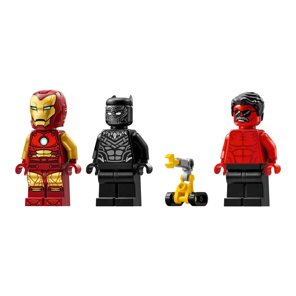 Personnages LEGO® Marvel – Ce jouet à construire comprend les figurines d’Iron Man, de Hulk rouge et de Black Panther, ainsi qu’une figurine LEGO de Dum-E, le robot assistant d’Iron Man, qui porte son fidèle extincteur