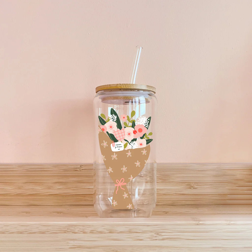 Comprend 1 couvercle en bambou et 1 paille en verre.