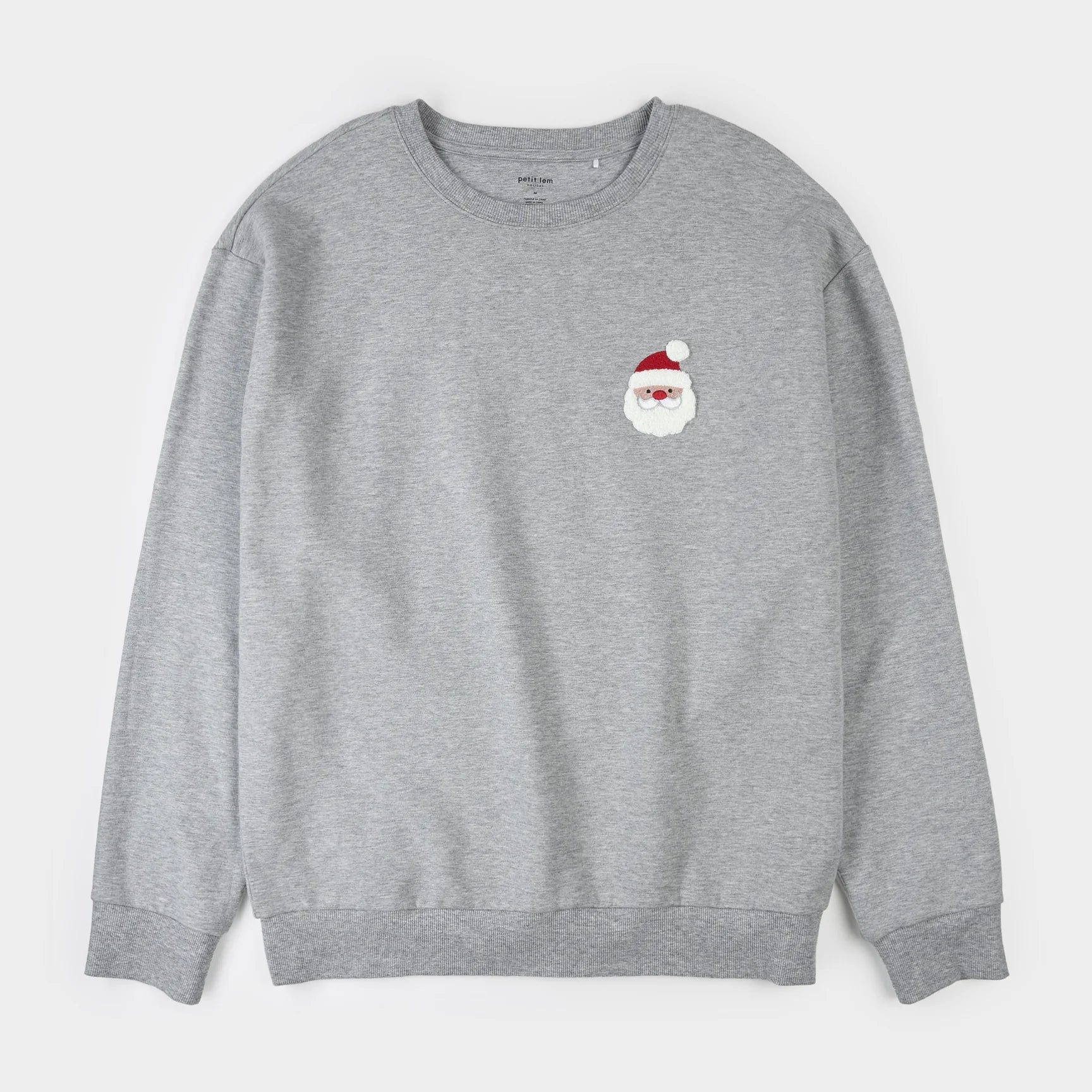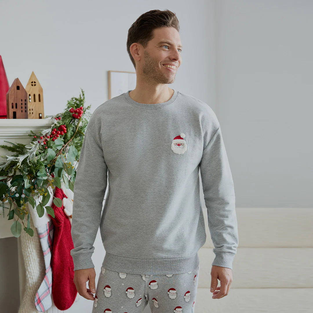 Ce pull gris douillet est orné d'un Père Noël en chenille brodé sur la poitrine, pour l'homme de la maison. Avec sa coupe ample, il a un style confortable qui peut facilement être porté par-dessus une chemise, un t-shirt ou un pyjama. Il un modèle assorti pour les enfants et une option Mère Noël pour maman. Fabriqué en molleton de coton biologique, il est ultra-doux, chaud et parfait pour une promenade hivernale le matin de Noël.