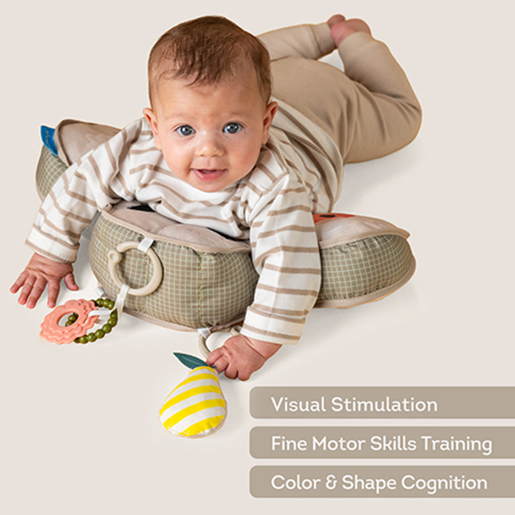 Un oreiller au design unique qui offre un soutien thoracique et aide bébé à s'entraîner à lever la tête et le cou et améliore le développement de sa motricité.